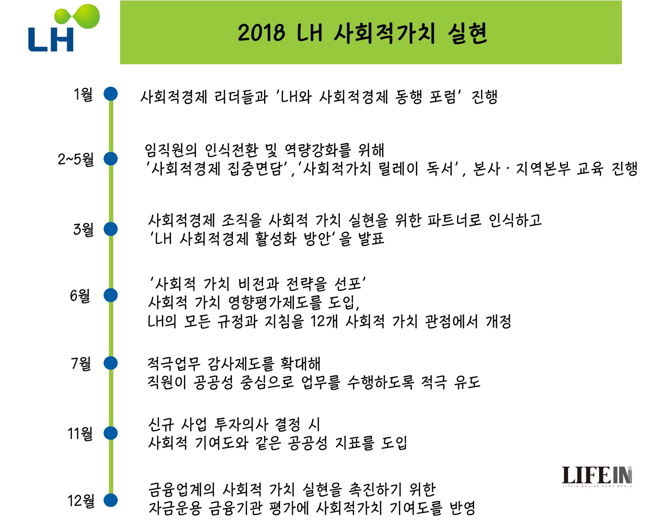 하지만, LH는 미래혁신실을 전담 조직으로 두고 사회적 가치를 실현하기 위한 준비를 착실하게 시작했다. 오영오 미래혁신실장은 "사회적 가치를 실현하기 위해 많이 만나 많이 들었다"고 소회를 밝혔다. 먼저, 사회적경제 리더, 전문가, 정부인사들을 만나 LH 경영과 사업시스템 전반에서 변화와 혁신을 시작했다. 임직원의 인식전환 및 역량강화 교육 등 사회적 가치 실현을 위한 토대를 다지기 위해 주력하며, 사업의 방향을 결정짓는 지표에 사회적 가치가 실현될 수 있도록 반영하고, 주요한 파트너로 사회적경제 조직을 선택했다.