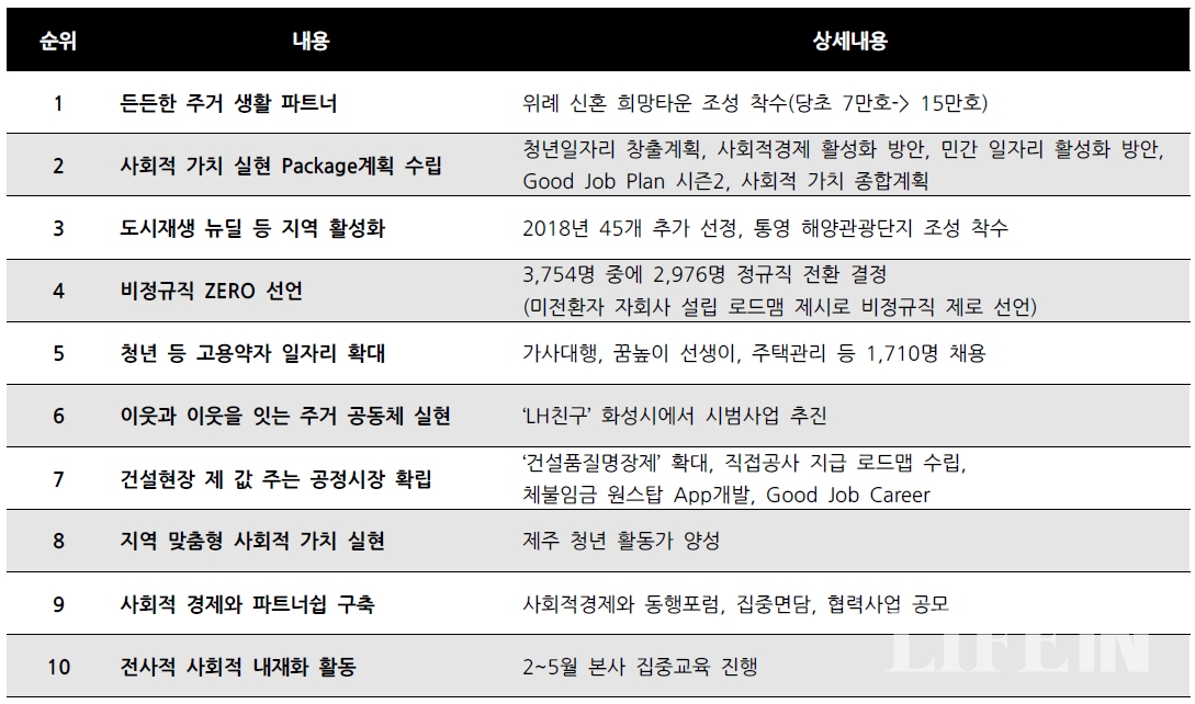 최근 LH는 고유의 사회적 가치를 실현해 LH만이 할 수 있는 사업을 많이 추진하고 있다. 'LH희망상가'를 통해 사회적기업, 청년, 경력단절여성, 영세소상공인에서 저렴하게 상가를 공급하고, 모바일 기반의 주거복지 플랫폼 '내친구', 입주민 대상 주거생활서비스 'LH 돌봄나눔둥지' 등이다. 'LH 사회적 가치의 밤' 행사에서 임직원들이 생각하는 LH가 만든 소셜 임팩트 TOP10이 공유됐다.