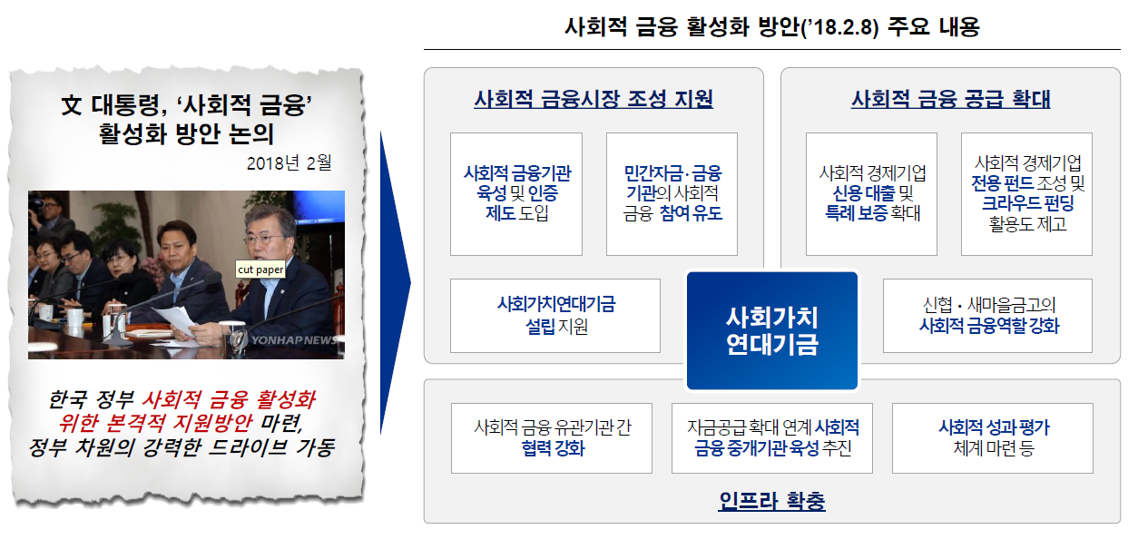 사회적금융이란 사회적기업, 협동조합, 자활기업, 마을기업 등에 공급하는 금융을 뜻한다. 사회적금융 도매자금 공급기관인 '사회가치연대기금은 5년간 3000억원 규모로 조성되며, 사회적경제 조직에 자본을 공급하고 사회적금융 중개기관을 육성하는 등 사회적금융 생태계 조성에 중추적 역할을 할 예정이다.