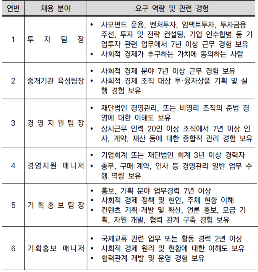 6개 직무에서 아래와 같은 요구역량과 관련 경험을 가진자를 우선적으로 고려하여 채용할 계획이다.