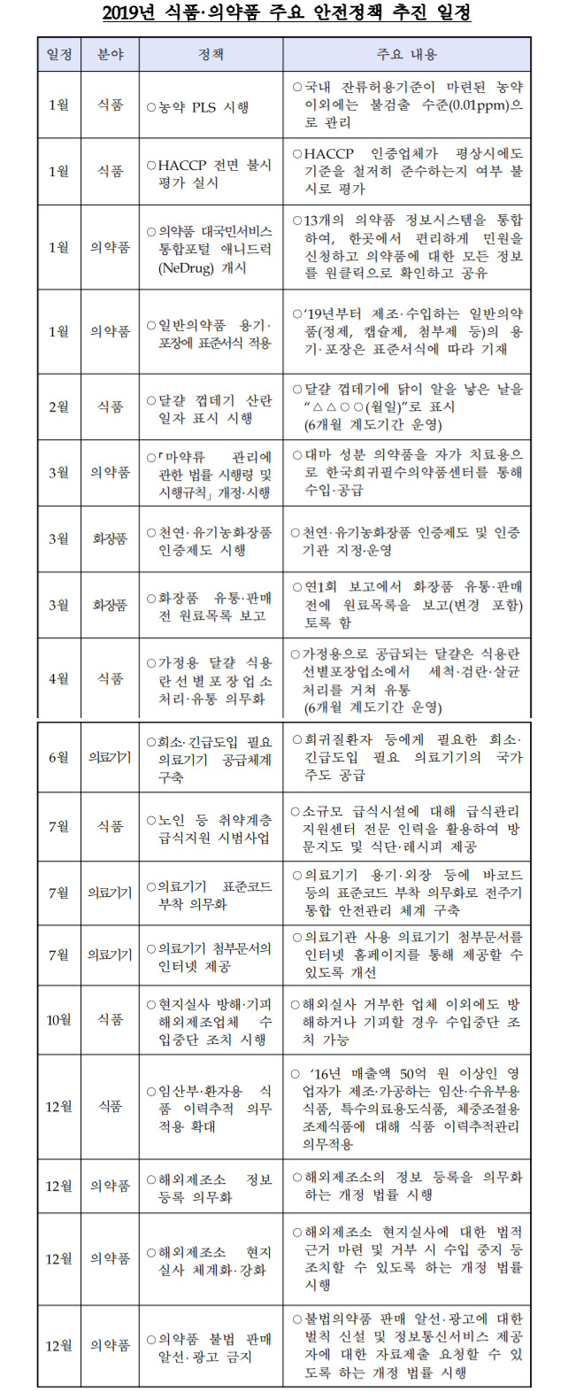 먼저 식품 분야는 ▲농약 허용물질목록관리제도(PLS) 시행(1월) ▲HACCP 전면 불시평가 실시(1월) ▲달걀 껍데기 산란일자 표시 시행(2월) ▲가정용으로 판매되는 달걀 식용란선별포장업소 처리·유통 의무화(4월) ▲노인 등 취약계층 급식 위생‧영양관리 지원 시범사업 추진(7월) ▲현지실사 방해·기피 해외제조업체 수입중단 조치 시행(10월) ▲임산부·환자용 식품 이력추적 의무적용 확대(12월) 등이다.