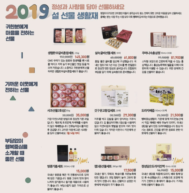 속까지 건강한 식품을 거품없는 가격대로 만나볼 수 있는 선물세트도 출시했다. Non-GMO 콩으로 키운 한우선물세트를 10만원 대의 가격으로 만나볼 수 있다. 이벤트 품목으로 선정된 한우 4종 사전 예약 시, 수미김종합선물세트, 돼지불고기선물세트, 압착유채유&우리밀올리고당선물세트 등을 추가 증정한다.