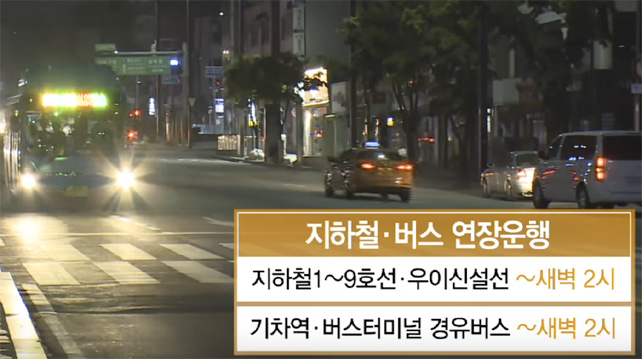 버스의 경우 주요 기차역과 고속·시외버스 터미널 앞 정류소(차고지 방면) 정차시각을 기준으로 새벽 2시까지 연장 운행한다. 역, 터미널을 2곳 이상 경유하는 노선의 경우 마지막 정류소 정차시각 기준이다.