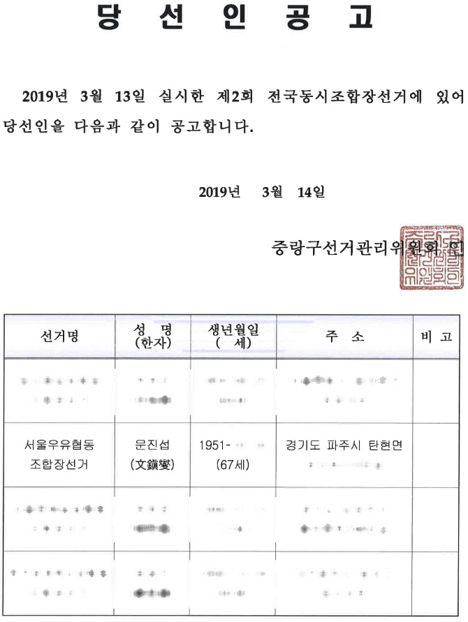 문진섭 신임 조합장은 전국동시조합장 선거일인 지난 13일 총선거인 1592명 중 1546명의 조합원이 참가한 조합장 선거에서 876표(득표율 56.7%)를 얻어 당선됐다. 임기는 2023년 3월까지 4년이다.