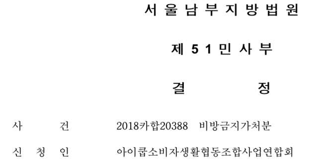 서울남부지법 제51민사부는 지난 5일 아이쿱소비자생활협동조합사업연합회(이하 아이쿱생협)가 주식회사 오가닉클러스터(이하 오가닉클러스터)의 노동자이자 전국공공운수사회서비스 노동조합(공공운수노조)의 광주전남지부 구례자연드림파크지회(이하 지회)의 조합원 겸 지회 회원인 문ㅇㅇ(지회장), 이ㅇㅇ(사무장)를 상대로 낸 비방금지가처분 신청을 받아들였다고 밝혔다.