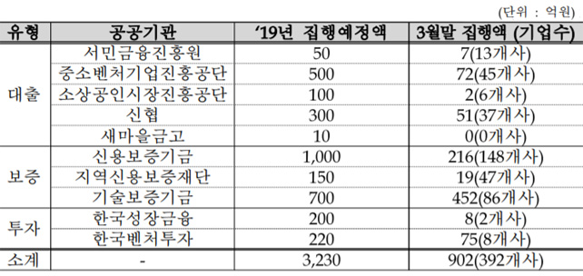 올해 3월말 현재 사회적경제기업 392개사에 902억원의 자금을 공급해, 올해 공급목표의 27.9%를 채운 상태다. 구체적으로 대출 부문에서 목표대비 15.3%인 132억원(132억원/860억원)을 지원했다. 이어 신보와 기보가 37.1%인 687억원(687억원/1850억원)의 보증을, 한국성장금융 및 한국벤처투자가 목표대비 19.7%인 83억원(83억원/420억원)을 투자했다.