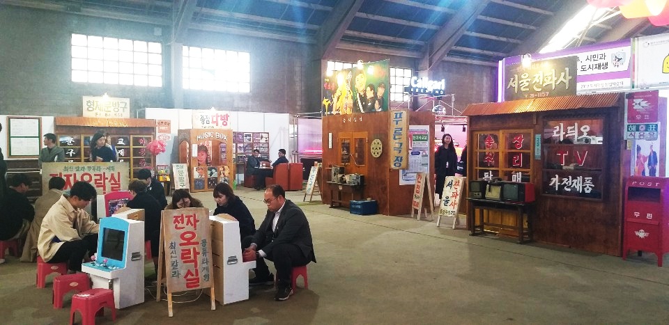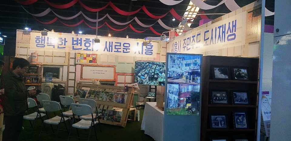 시흥시 부스는 2010년부터 일찍이 희망마을 만들기 사업을 통해 주민공동체 중심의 재생을 추진해 온 곳답게 마을 카페와 마을회관에서 직접 가져온 사진액자와 의자 테이블로 꾸며져 있었다.
