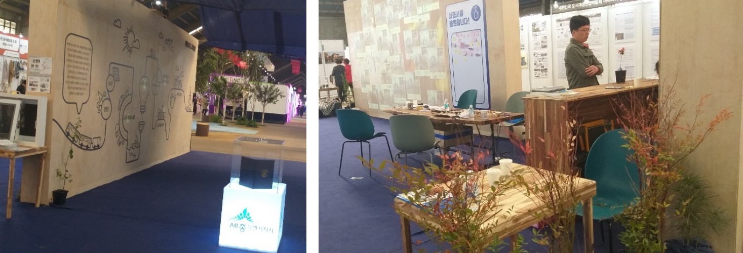 '청춘조치원 프로젝트'로 '도시재생 산업박람회' 공모 최고상인 대통령상을 수상한 세종시는 부스 제작을 아예 주민들과 활동가들이 맡았다. 목공 수업을 함께 받은 주민들이 일주일 전부터 박람회장을 찾아 테이블과 벽 등 모두를 만들었고, 박람회 이후 수거해 마을에서 활용할 것이라고 했다.