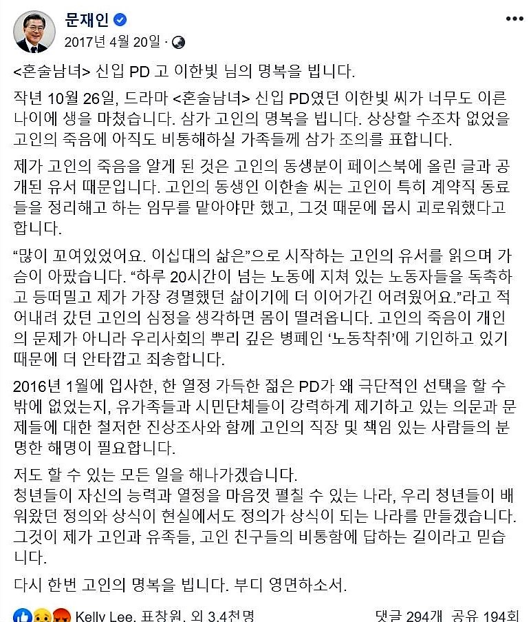 이한빛 PD의 죽음이 언론을 통해 보도되자 대통령님께서는 대선후보 시절에 애도와 함께 진상규명과 재발방지 대책을 요구하며 다시는 이한빛 PD와 같은 죽음이 일어나지 않도록 하겠다는 메시지를 보냈습니다. 그 메시지는 무척이나 큰 힘이 되어 계속 이한빛 PD의 사망에 자신들의 책임을 인정하지 않던 CJ ENM이 유가족과 방송 노동자들 앞에서 책임을 인정하는 계기가 되었습니다. 동시에 CJ ENM은 유가족들에게 진심 어린 사과와 함께 방송 노동환경 개선과 재발방지 대책 이행을 약속했었습니다. 적반하장으로 일관하던 CJ ENM을 움직이게 만든 힘을 주신 대통령님께 뒤늦게나마 감사의 말씀을 올립니다.