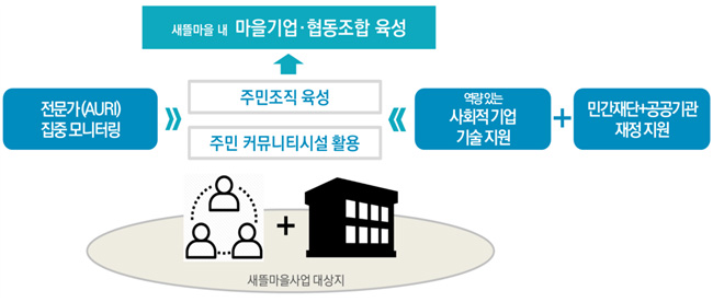 민관협력형 사회적경제 육성사업도 진행할 계획이다. 사회적경제 육성사업은 주민으로 구성된 마을기업·협동조합이 지난 4년 간 새뜰사업으로 조성된 마을카페·공동작업장을 운영하며 수익을 창출하고 자생적으로 공동체를 유지할 수 있도록 지원하는 사업이다.