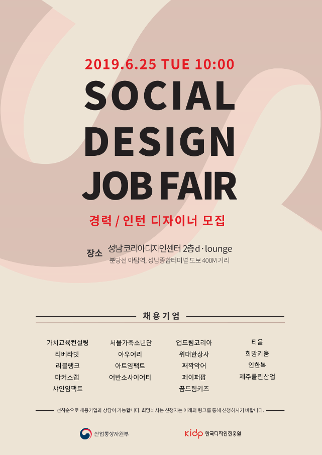 한국디자인진흥원이 사회적기업과 디자이너를 연결하는 채용 행사를 개최한다. 오는 25 일 '2019 소셜 디자인 잡페어(2019 SOCIAL DESIGN JOB FAIR)'를 열고 디자이너와 기업 간 채용상담을 진행한다.