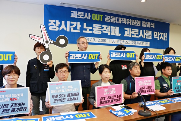 노동자들의 과로사, 자살, 대형사고가 잇따르자 민주노총, 노동건강연대, 건강권실현을위한보건의료단체연합, 민변, 참여연대 등 30개 단체가 모여 '과로사 아웃(OUT) 공동대책위원회'를 만들었다. 과로사 아웃(OUT) 공동대책위원회는 12일 오전 서울 정동 프란치스코 회관에서 출범 기자회견을 열었다.