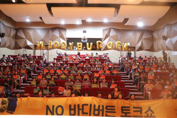 토크쇼 끝 행사로 참가자들이 객석에서 바디버든 줄이기 캠페인 손팻말을 들고 전체 사진을 찍었다. 사진 이상미.