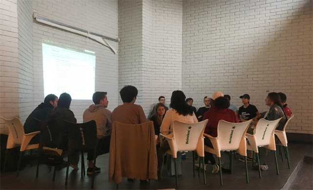 이제 MTA로 넘어가보자. 앞에서도 이야기했듯이 MTA는 몬드라곤대학교 경영대학의 공식적인 프로그램으로 창의적인 스타트업 훈련 프로그램이다. 방문한 7월 2일 빌바오시의 한적한 외곽 카페 공간에서는 MTA의 1학년 팀 중의 한 팀이 평가 토론을 하고 있었다. 이 팀을 코치하고 있는 사람은 HBM(해피브릿지협동조합 경영연구소) 직원인 김강현 씨다. 김 코치에게 평가 방법 등을 물어봤다. 이곳의 평가 방법은 학생 개개인의 학점을 코치나 교수가 주는 것이 아니라 12명의 팀원들이 준다는 것이다. 1학기 동안 과제 참여, 사업 시도, 수업 태도 등을 함께 한 학생들이 서로 토론을 통해 평가한다는 것이다. 온정적으로 또는 개인의 친소 관계에 의해 영향을 받을 것 같은데 전혀 그렇지 않다고 한다. 소수의 몇 사람이 참여하면 그럴 수 있는데 12명이 토론하기 때문에 매우 객관적이고 건강하게 평가한다는 것이다. 코치의 역할도 학생들이 길을 스스로 찾도록 서포트 하는 것이지 코치가 교육하고 가르치는 개념이 아니라는 것이다. 코치도 학생들에게 배우고 학생들도 코치에게 배우는 '파울로 프레이리의 교육론이 반영된 기법이 아닌가?'하는 생각이 들었다.