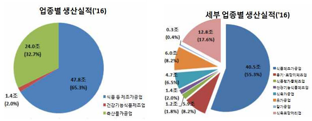 '16년 업종별 생산실적은 식품제조‧가공업이 40조5,549억원(55.3%)으로 가장 많았고, 식육포장처리업(12조8,733억원, 17.6%), 유가공업(6조241억원, 8.2%), 용기·포장지제조업(5조9,806억원, 8.2%, 옹기류포함), 식육가공업(4조7,905억원, 6.5%), 건강기능식품제조업(1조4,715억원, 2.0%), 식품첨가물제조업(1조2,982억원, 1.8%) 순이다.