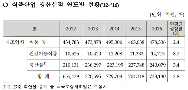 식품 등 생산실적은 총 47조8,336억원으로 '15년(46조5,038억원) 대비 2.9% 증가했으며, '12년 이후 연평균 2.4%로 꾸준히 성장하고 있다.