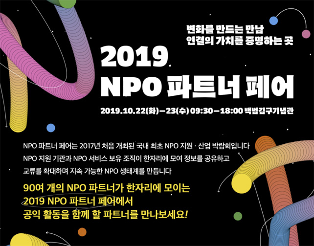 비영리기관(NPOㆍNon-Profit Organization)의 장기적이고 지속적인 성장을 위한 산업 기반과 생태계 구축을 위한 '2019 NPO 파트너 페어'가 22일과 23일 양일간 용산구 백범김구기념관에서 개최된다.