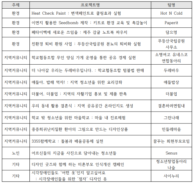 공모전에는 지난 7월 한달간 환경, 노인, 지역사회 등 지역사회 전반에 이슈가 되고 있는 사회문제를 스스로 해결해보고자하는 97팀이 참여했다. 그 중 심사를 통해 청소년부문 6팀, 일반부문 9팀, 총 15팀을 1차 선정, 활동지원금 뿐만 아니라 사회혁신 협력기관들의 1:1 멘토링, 중간공유회 참여 등을 제공해 이들의 지속적인 활동을 촉진하고, 네트워킹을 넓히는 기회를 제공했다.