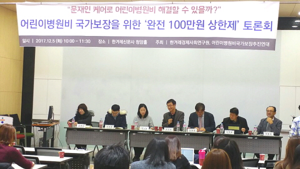어린이병원비 상한제 도입요구는 문재인 정부의 의료보장 정책인 '문재인 케어'에 대한 기대와 비판이 함께 담겨 있는 토론회이기도 했다. 한겨레경제사회연구원과 어린이병원비국가보장추진연대가 주최했다. 토론회는 12월 5일(화) 오전 10시 한겨레신문 청암홀에서 진행됐다.