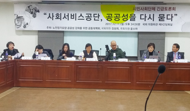 지난 12월 11일 국회 의원회관 제9간담회실에서는 김상희 국회의원(더불어민주당)과 윤소하 국회의원(정의당), 노인장기요양 공공성 강화를 위한 공동대책위원회(이하 공대위) 공동주최로 '사회서비스공단, 공공성을 다시 묻다'라는 주제로 긴급토론회가 개최됐다.