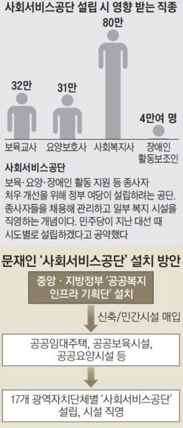 문재인 대통령은 후보 시절 공공성 강화와 양질의 일자리 창출을 위해 '보육과 요양 등 사회서비스를 국가가 직접 제공하는 기반을 마련하겠다'는 공약을 제시했다. 또한 지난 7월 12일 이 같은 공약을 이행하기 위해 전국 17개 시·도별 사회서비스공단을 설립할 계획을 구체적으로 발표했다.