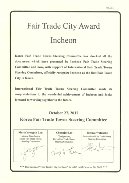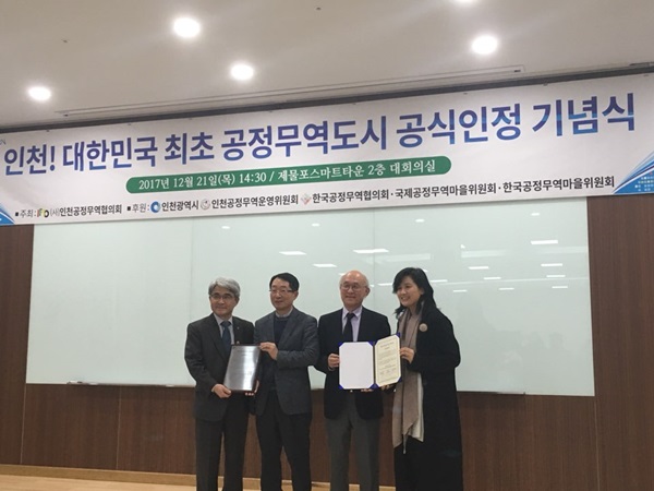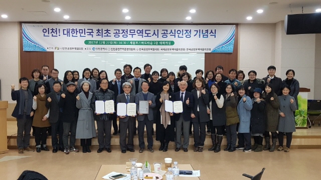 인천광역시가 지난 2010년 공정무역도시 선언 이후 7년의 노력 끝에 올해 10월 공식적으로 공정무역도시가 됐다. 아시아 국가로는 일본에 이어 두 번째이다. 인천은 국제공정무역마을위원회(IFTTSC)와 한국공정무역마을위원회(KFTTSC)의 까다로운 조건을 충족해 사회적, 윤리적으로 책임을 다하는 국제도시의 위상을 갖게 되었다. 이를 축하하기 위해 12월 21일(목) 제물포 스마트타운 대강당에서 ‘인천! 대한민국 최초 공정무역도시 공식인정 기념식’이 개최됐다.