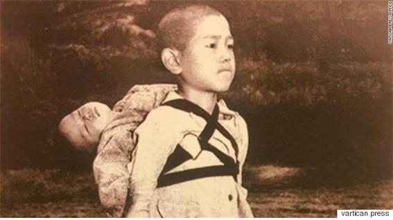 새해를 맞으며 지인들의 카톡 메시지가 한꺼번에 몰려온다. 모두들 건강과 행복을 비는 내용들이다. 보통 사람들이 소소하고 새로울 것 없는 인사를 나누는 동안 교황은 강렬한 신년메시지를 전했다. 미군이 터트린 원자폭탄에 피해를 입은 일본 나가사키 소년의 사진을 넣어 전쟁의 참상을 고발하는 연하장을 배포한 것이다. 이미 목숨을 잃어 뒤로 쳐진 어린동생을 등에 업고 화장 순서를 기다리고 있는 소년은 슬픔을 견디느라 입을 꾹 다문 채 굳은 표정을 하고 있다. 교황은 이를 ‘전쟁의 결과’라고 적고 서명했다. 사진 설명에는 “어린 소년의 슬픔은 피가 흘러나오는 입술로만 표현 된다”고 적었다. 나는 사진을 본 순간 한동안 멍하게 바라보게 됐다.